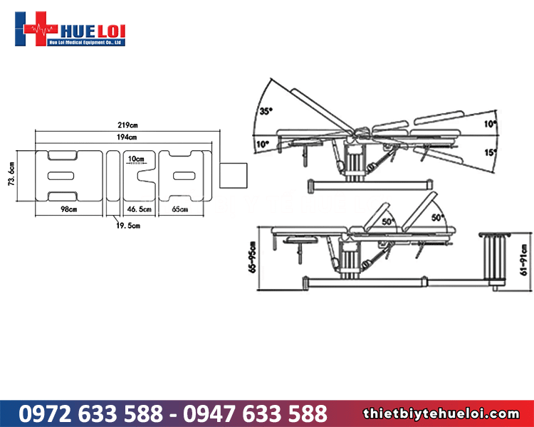 Thông số Giá trị Chiều dài tổng 194 cm Chiều rộng 73,6 cm Chiều cao 65–95 cm Chiều cao bệ kéo 61–91 cm Góc tựa lưng -10° → +35° Góc nâng chân -15° → +10° Góc tấm thứ 3 0° → +50° Góc tấm thứ 4 0° → +50° Đệm Dày 5 cm – Mút 36 kg/m³ Chứng nhận CE, FDA, ISO 13485:2016 Bảo hành 5 năm khung – 3 năm điện Tải trọng 250 kg Kích thước đóng gói 199 × 74 × 75 cm CBM 1.1