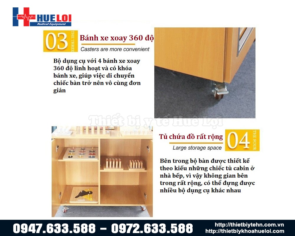 Mặt bàn tập luyện rất rộng có thể cho phép nhiều người tập luyện cùng lúc, 3 tủ cabin ở bên dưới cho phép cất dụng cụ khi không luyện tập, cùng với 4 bánh xe xoay 360 độ (có khóa bánh) giúp cho việc di chuyển dễ dàng.