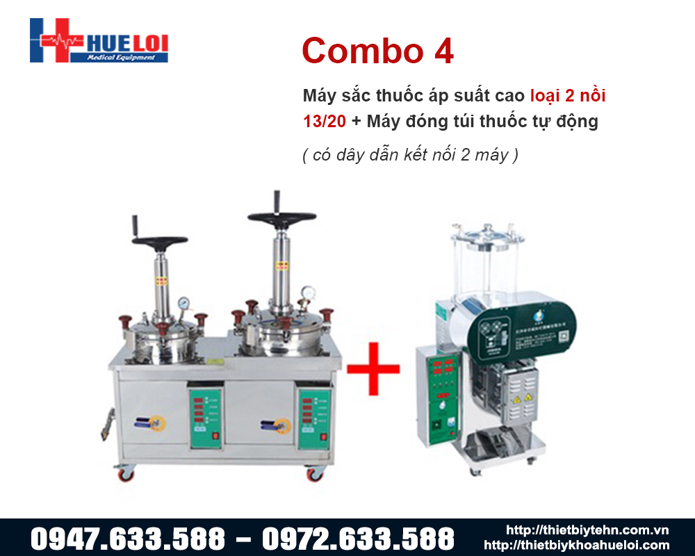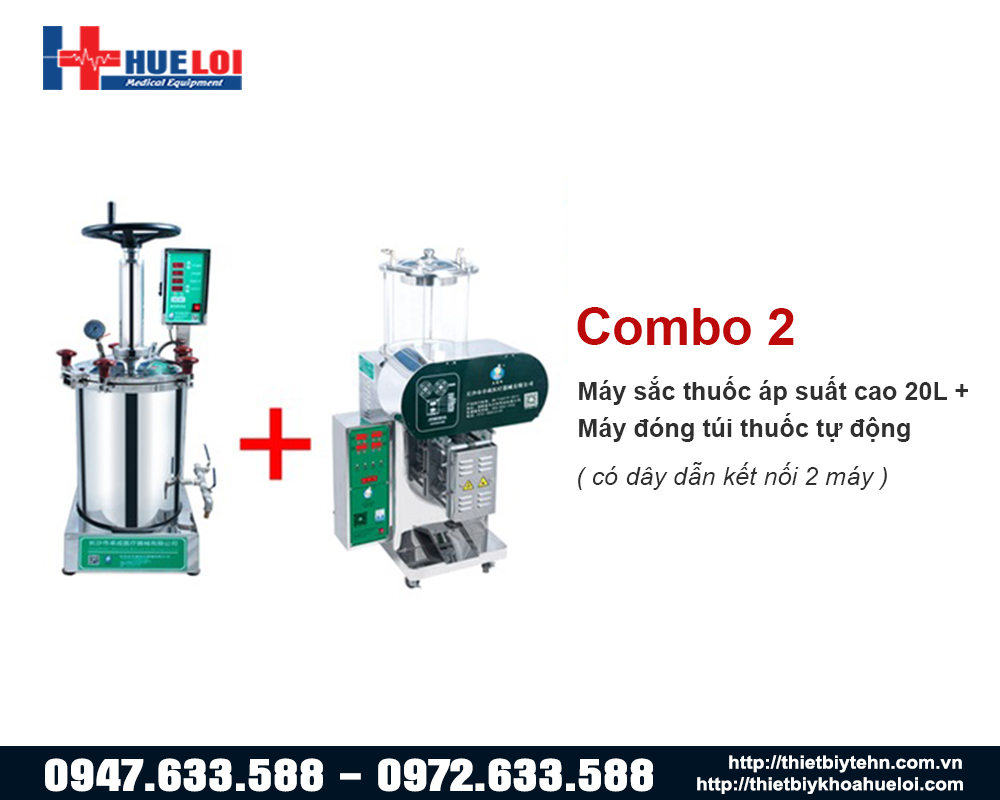 - Combo 1: Máy sắc thuốc áp suất cao 20L + Máy đóng túi tự động = 45.000.000 VND