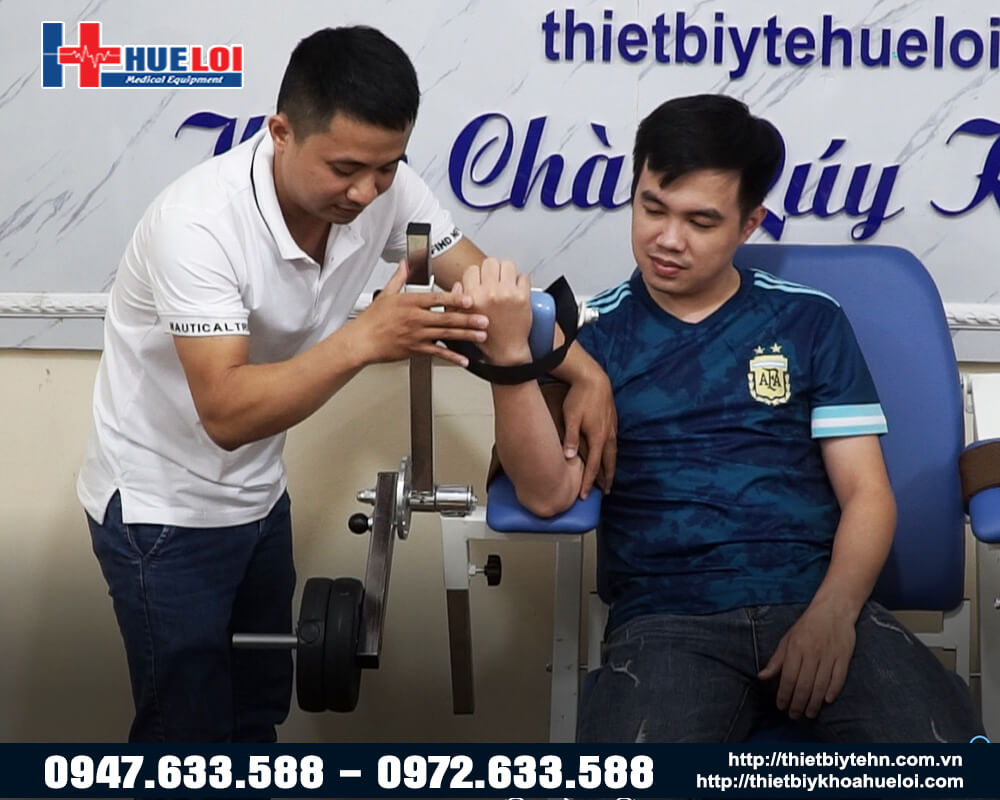 - Động tác tập luyện tương ứng với động tác gấp duỗi khuỷu tay. Khuyến cáo nên bắt đầu tập với trở lực bé nhất, thời gian tập cho mỗi lần là 15-20ph, mỗi ngày nên tập 1-2 lần và phải kiên trì tập luyện hàng ngày, tăng dần mức trở lực.