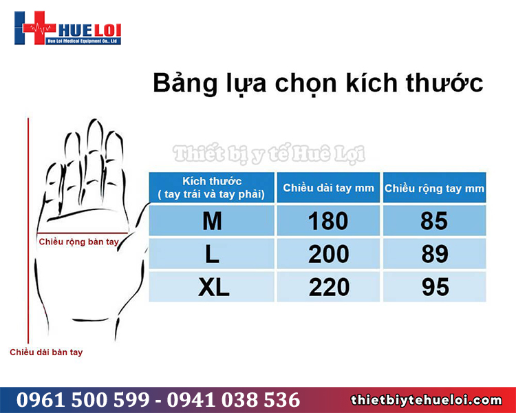 Có thể tùy chọn găng tay trái hoặc tay phải theo bên tổn thương, kích cỡ mỗi tay đối chiếu theo bảng phía dưới