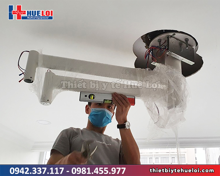 "Hình 10: Đội ngũ kỹ thuật Huê Lợi tận tâm, tỉ mỉ lắp ráp đèn mổ 2 nhánh cho phòng khám – đảm bảo chuẩn kỹ thuật và chất lượng vận hành tối ưu"