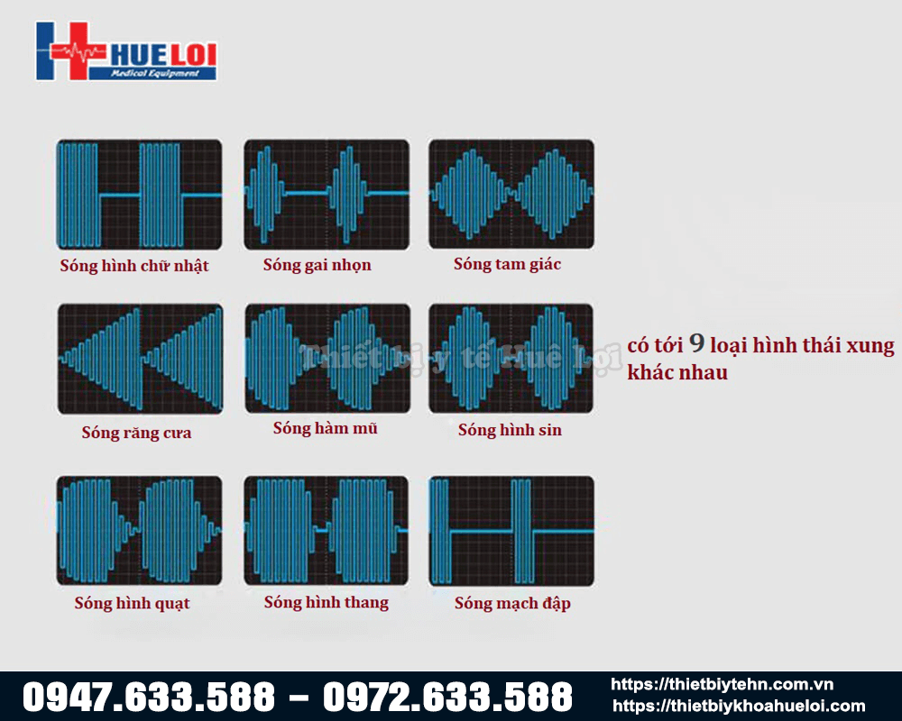 - Có tới 9 loại hình thể xung khác nhau tránh được trường hợp bệnh nhân thích nghi với 1 loại sóng nhất định gây giảm tác dụng của điện xung trị liệu