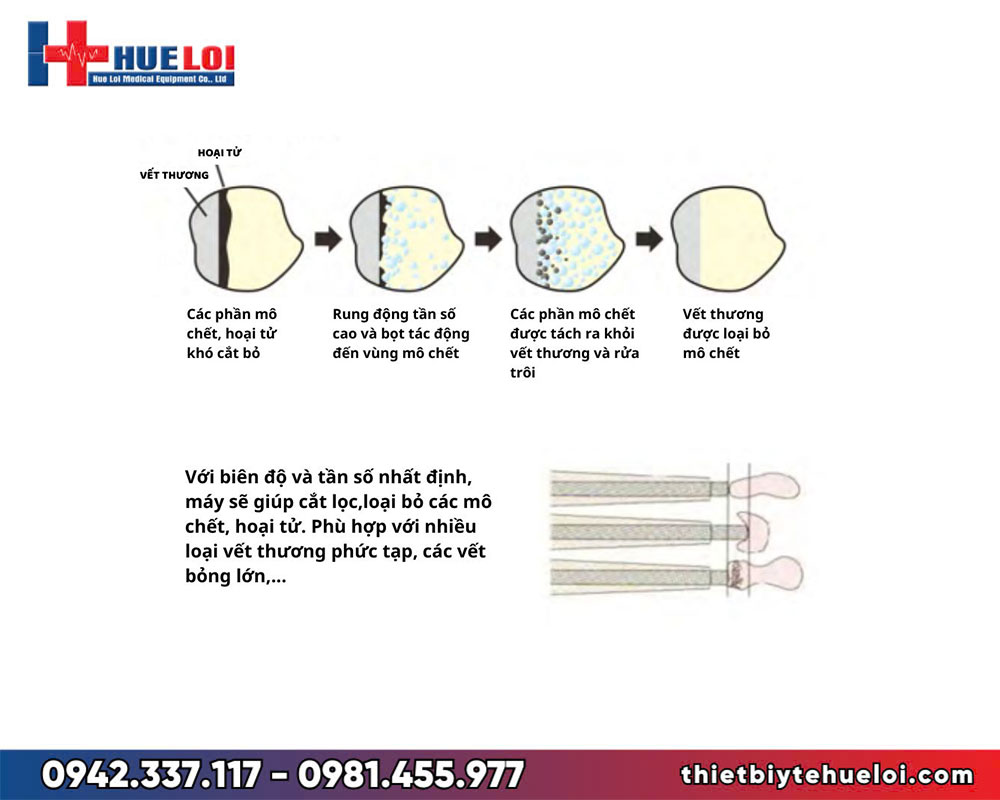 - Hiệu ứng tạo vi bọt: Sóng siêu âm sẽ tạo ra trường vi bọt, các vi bọt sẽ vỡ hình thành các đợt sóng để phân tách/cắt lọc các mô hoại tử và có tác dụng diệt khuẩn