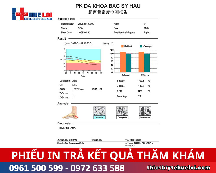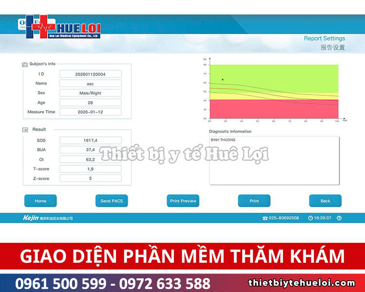 Máy đo mật độ xương gót chân bằng sóng siêu âm OSTEOKJ3000 là giải pháp tối ưu cho chẩn đoán loãng xương với chi phí đầu tư tốt nhất trên thị trường hiện nay. Máy sử dụng công nghệ sóng siêu âm an toàn, không bức xạ, cho phép đo nhanh tại vị trí xương gót chân, nơi nhạy cảm với những sự thay đổi về mật độ khoáng, giúp phát hiện sớm tình trạng loãng xương. Thiết bị sử dụng bộ chỉ số đánh giá toàn diện (BUA, SOS, OI, T-score, Z-score), giúp đánh giá toàn diện các yếu tố ảnh hưởng đến mật độ xương và phù hợp với nhiều nhóm tuổi trong tầm soát nguy cơ loãng xương.