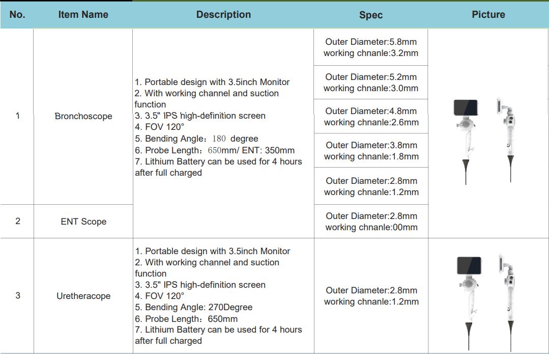 + Khí phế quản: Dài 65/35cm với đường kính ống mềm/kênh can thiệp là: 5.8/3.2 hoặc 5.2/3.0 hoặc 4.8/2.6 hoặc 3.8/1.8 hoặc 2.8/1.2mm.
