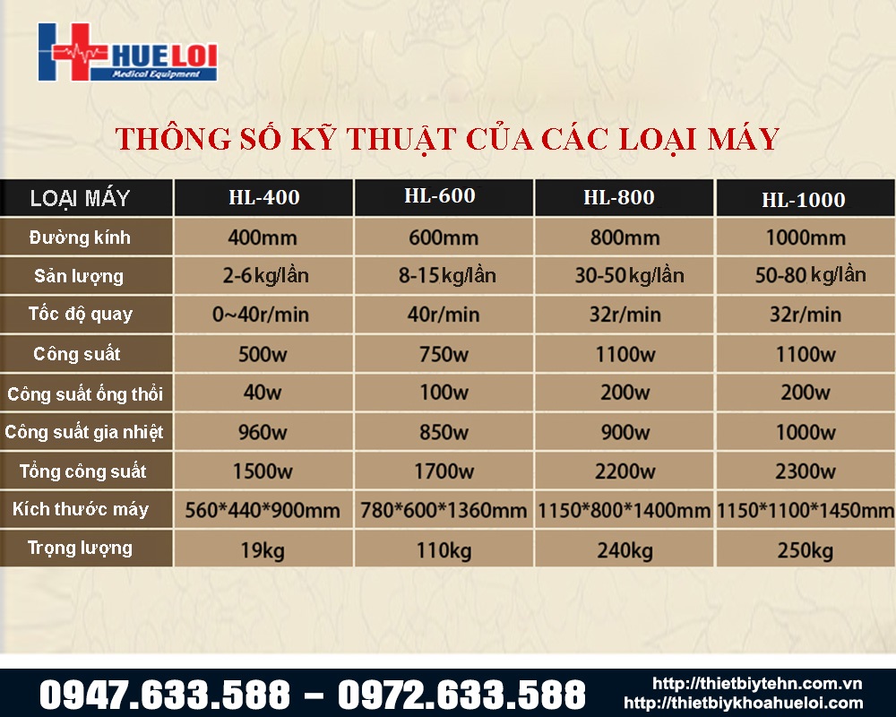 Lưu ý: HL-600,HL-800,HL-1000 có hai lựa chọn nguồn điện 2 pha (220V) và 3 pha (380V)
