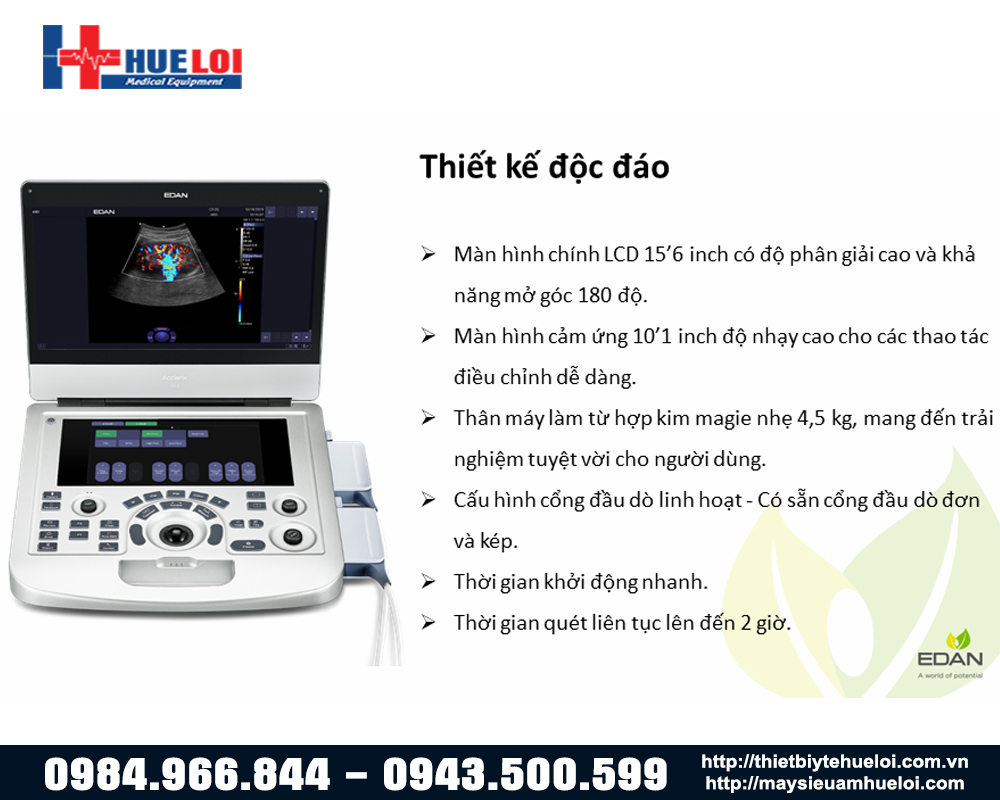 - Đột phá về công nghệ vật liệu: EDAN AX3 có thân vỏ được làm từ hợp kim Lithium-Magie (có độ cứng gấp 4 lần và nhẹ chỉ gần bằng một nửa so với vỏ làm từ nhôm thông thường) mang đến khả năng chịu va đập cực tốt và tăng độ bền lên gấp nhiều lần so với các máy siêu âm xách tay thông thường.