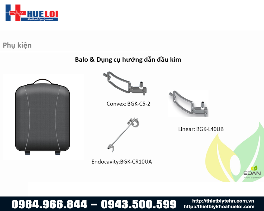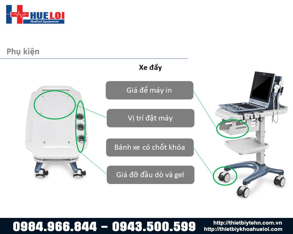 Ngoài ra đi kèm với máy còn có các phụ kiện hữu ích như: xe đẩy, balo đựng máy và các dụng cụ hướng dẫn đầu kim sinh thiết