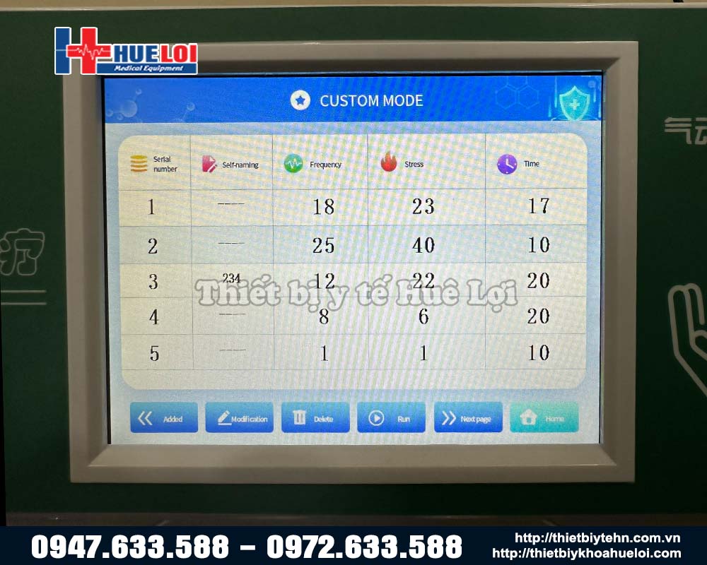 - Các thông số cài đặt được : Tên chương trình, tần số điều trị, áp lực điều trị, thời gian điều trị.