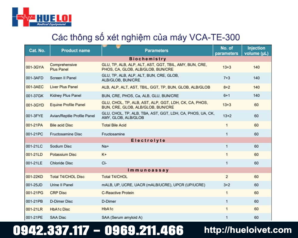 Thông số kỹ thuật máy xét nghiệm sinh hóa thú y VCA-TE-300: