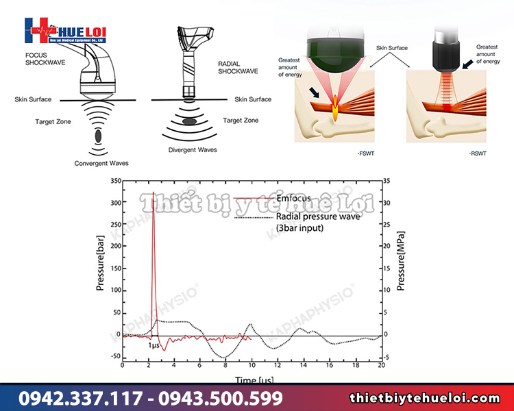 Tiêu chí Sóng Hội Tụ (EMFOCUS-III) Sóng Phân Kỳ Nguyên lý hoạt động Sử dụng cuộn cảm điện từ để tạo sóng xung trong nước, sau đó hội tụ tại một điểm tiêu cự sâu trong mô. Điều này cho phép truyền năng lượng tập trung và chính xác vào vùng tổn thương mục tiêu. Tạo sóng từ một đầu phát cơ học (thường dùng khí nén), sóng lan tỏa dần từ bề mặt da vào trong theo dạng hình nón ngược, năng lượng phân tán, không tập trung. Độ sâu tác động Có thể thâm nhập sâu đến 65mm, tác động hiệu quả đến mô cơ sâu, gân, xương hoặc vùng tổn thương gần khớp. Độ sâu giới hạn ở mức 30–35mm, chủ yếu phù hợp với mô nông, tổn thương cơ – gân nông. Độ chính xác điều trị Sóng tập trung vào một điểm nhỏ (vùng tiêu điểm), cho phép điều trị chính xác vị trí tổn thương, giảm ảnh hưởng mô lành xung quanh. Sóng phân tán trên diện rộng, ít chính xác, thường điều trị lan tỏa nên hiệu quả trên tổn thương điểm sâu kém hơn. Cường độ và hiệu quả Cường độ cao hơn, tác động cơ học sâu, hiệu quả rõ rệt trong thời gian ngắn; có thể sử dụng cho các bệnh lý phức tạp như rối loạn cương dương (ED), viêm gân sâu, tổn thương khớp. Cường độ thấp hơn, tác động cơ học nông và lan rộng; phù hợp hơn cho điều trị đau cơ nông, viêm gân bề mặt, thư giãn cơ. Cảm giác điều trị Do sóng đi sâu và không tác động mạnh vào da, bệnh nhân ít đau, dễ chịu hơn, đặc biệt khi cần sử dụng năng lượng cao để đạt hiệu quả tối ưu. Sóng tác động mạnh ngay từ bề mặt da, nên có thể gây đau, châm chích nếu dùng ở mức năng lượng cao. Thời gian mỗi buổi điều trị Nhờ công nghệ hội tụ chính xác và hiệu quả cao, mỗi buổi trị liệu chỉ cần 5–10 phút, và thường chỉ cần 1 buổi mỗi tuần. Cần 2–3 lần/tuần, mỗi buổi từ 10–15 phút để đạt hiệu quả tương đương. Ứng dụng lâm sàng Hiệu quả trong vật lý trị liệu, chỉnh hình, phục hồi chức năng, tiết niệu (ED), thẩm mỹ, da liễu và thú y, phù hợp nhiều nhu cầu điều trị. Phổ biến trong các phòng khám nhỏ, massage trị liệu, phục hồi cơ bản, điều trị đau cơ hoặc mô mềm nông. Chi phí đầu tư thiết bị Là công nghệ cao hơn nên chi phí đầu tư ban đầu cao hơn, tuy nhiên mang lại hiệu quả điều trị vượt trội và tiết kiệm thời gian cho bác sĩ và bệnh nhân. Chi phí thấp hơn, phù hợp với cơ sở nhỏ, điều trị cơ bản nhưng giới hạn về độ sâu và khả năng ứng dụng. Hiệu quả kinh tế lâu dài Hiệu quả cao hơn, giảm số buổi điều trị, tiết kiệm thời gian và công sức cho cả cơ sở và bệnh nhân. Kém hơn, mất nhiều thời gian điều trị, khó xử lý các ca phức tạp. => Ngoài dòng máy sóng xung kích hội tụ EMFOCUS-III, Huê Lợi còn cung cấp nhiều dòng máy xung kích phân kỳ với đa dạng mức giá, phù hợp nhiều nhu cầu điều trị khác nhau. Bên cạnh đó, chúng tôi còn phân phối nhiều thiết bị vật lý trị liệu hiện đại khác. Quý khách có thể xem chi tiết sản phẩm [TẠI ĐÂY].