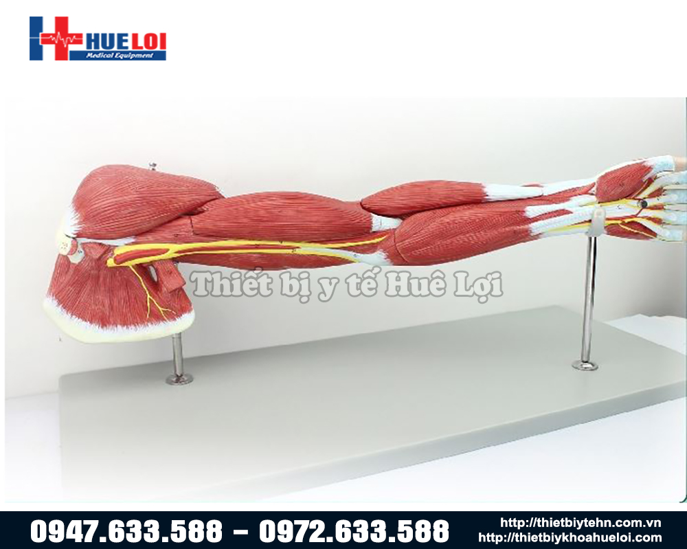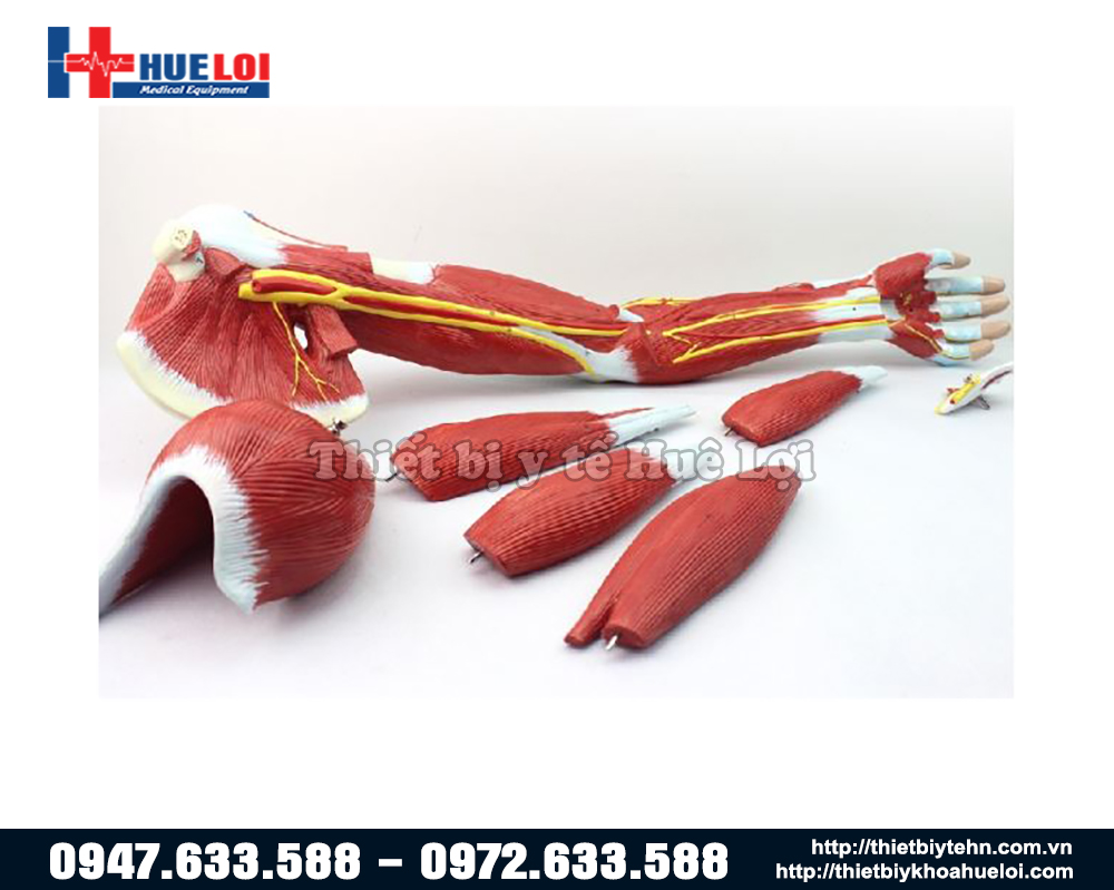 Mô hình giải phẫu cơ và thần kinh chi trên thể hiện được toàn bộ các nhóm cơ của chi trên từ vai, cánh tay, cẳng tay, bàn tay và đặc biệt các nhóm có này có thể tách rời để nghiên cứu giải phẫu sâu bên trong của chi trên. Sau khi tách rời các nhóm cơ sẽ để lộ đường đi của mạch máu, thần kinh chi phối cho chi trên. Rất phù hợp để giảng dạy giải phẫu tại các trường Cao đẳng, Đại học y khoa.