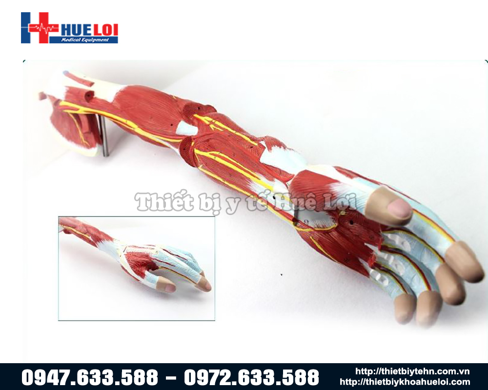 - Ngoài ra, Mô hình còn thể hiện các nhóm cơ của vùng cánh tay, cẳng tay, bàn tay và đặc biệt có thể tách rời nhiều nhóm cơ để bộc lộ rõ cấu trúc giải phẫu bên trong của chi trên.
