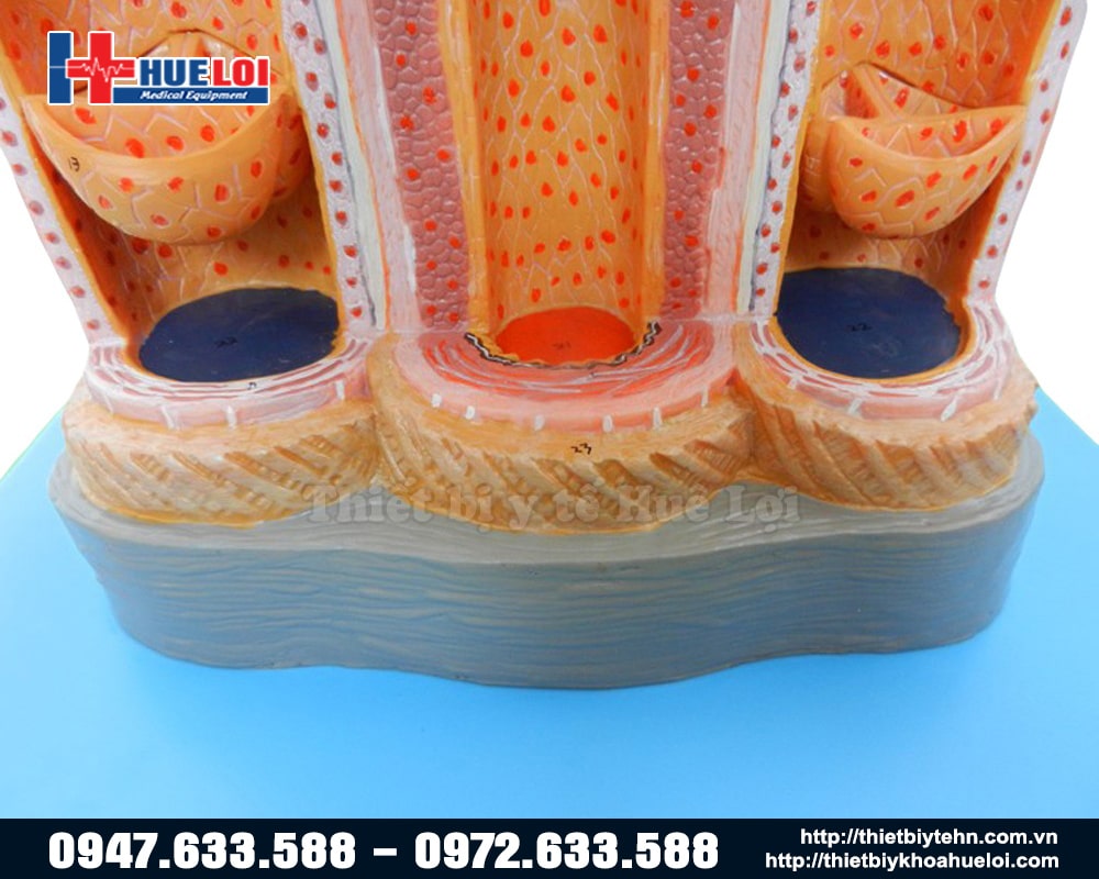 Mô hình động mạch tĩnh mạch bóc tách từng lớp phóng đại mô tả mặt cắt ngang và mặt cắt dọc qua động mạch tĩnh mạch người qua đó mang lại các nhìn trực quan và sinh động. Mô hình mô tả 23 vị trí giải phẫu khác nhau được đánh số chi tiết, thích hợp sử dụng trong giảng dạy và học tập môn giải phẫu hoặc mô phôi học tại các trường đại học, cao đẳng y.