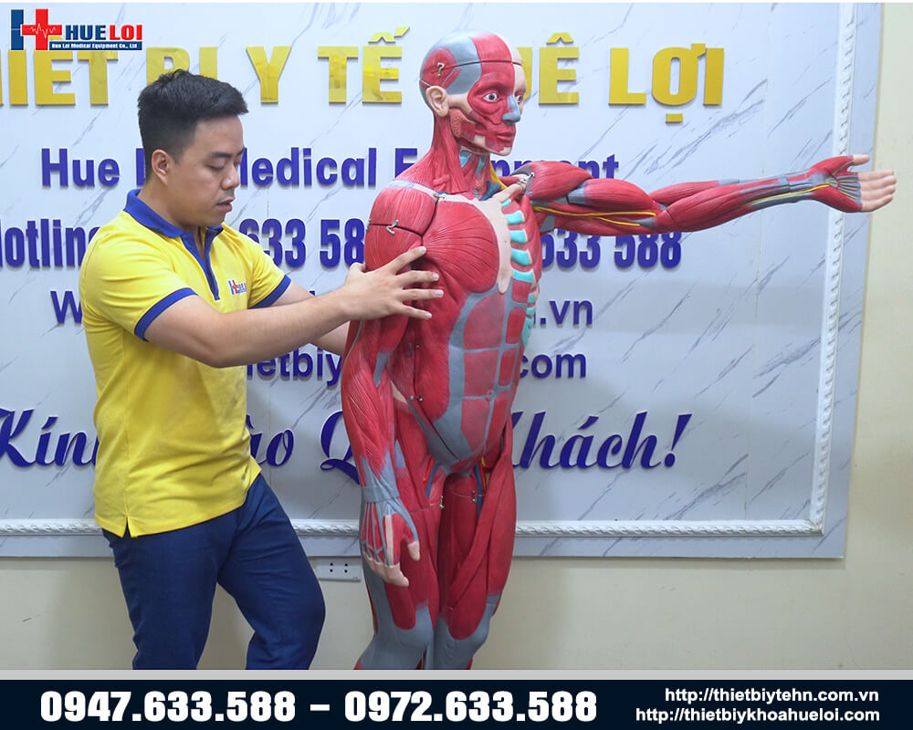- Mô hình giải phẫu cơ và toàn bộ nội tạng cao 170cm bao gồm 27 phần: cơ toàn thân, cơ ngực và cơ bụng, cơ chi trên và dưới, xương sọ, não và các cơ quan nội tạng của ngực và bụng.