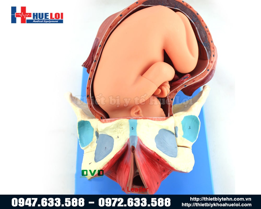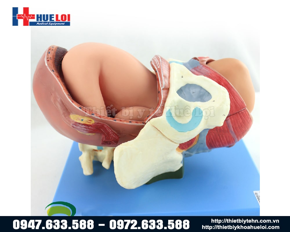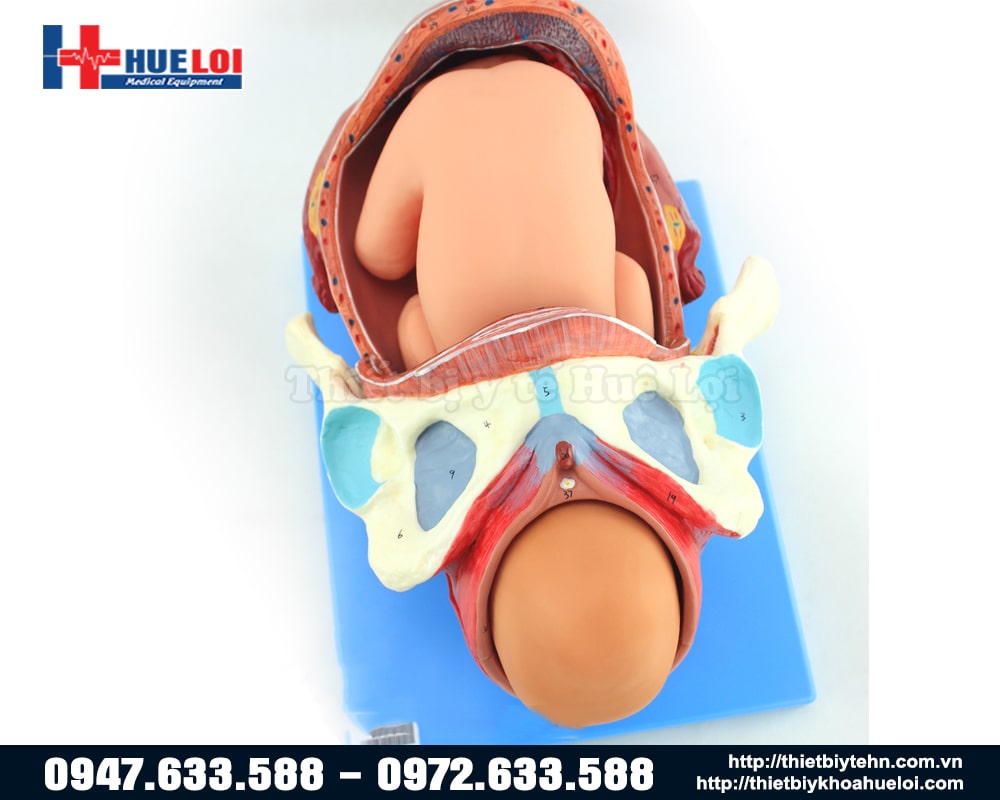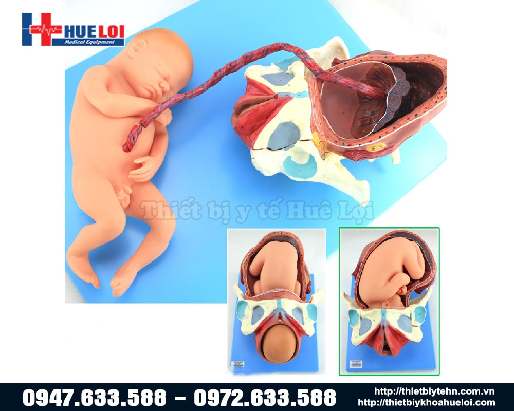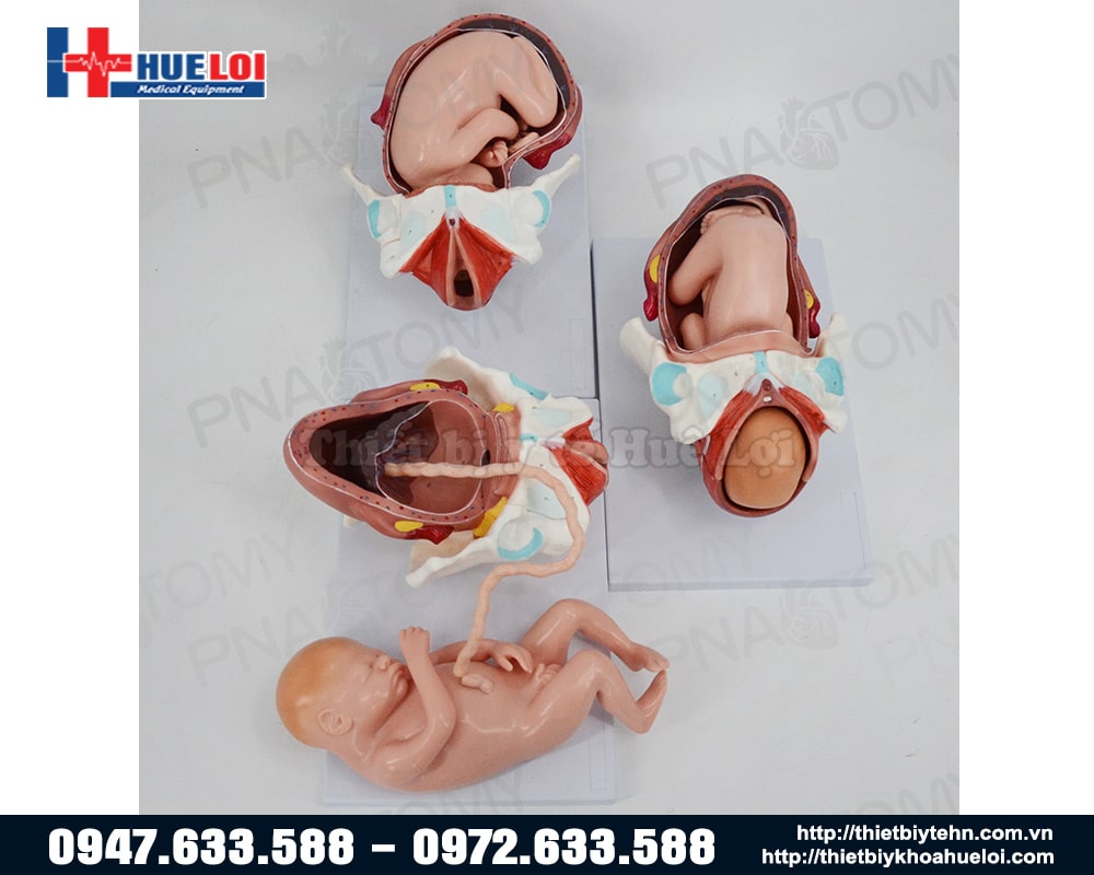 - Mô hình bao gồm 3 bộ thai nhi: khung chậu, tử cung, thai nhi đủ tháng, nhau thai, dây rốn, v.v.