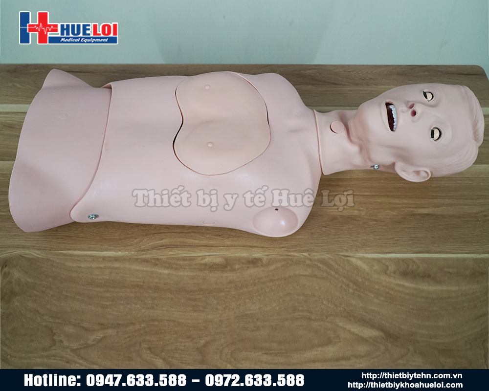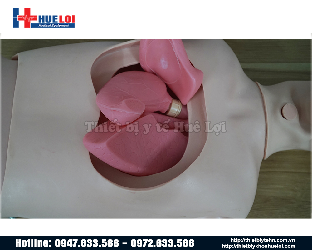 - Mô hình nửa thân trên của cơ thể với tỉ lệ 1:1 và có cấu tạo đầy đủ các cơ quan giải phẫu như khoang miệng, thực quản, khí quản, dạ dày, 2 lá phổi...