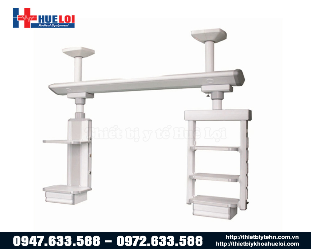 Cánh tay đôi treo trần trong phòng mổ sử dụng trong phòng mổ, phòng ICU, cánh tay dài di chuyển xa và linh hoạt, có lỗ cắm Oxy và lỗ hút áp lực, ngoài ra còn rất nhiều chức năng khác giúp ích cho nhân viên y tế trong những cuộc phẫu thuật hoặc chăm sóc bệnh nhân tại phòng cấp cứu ICU