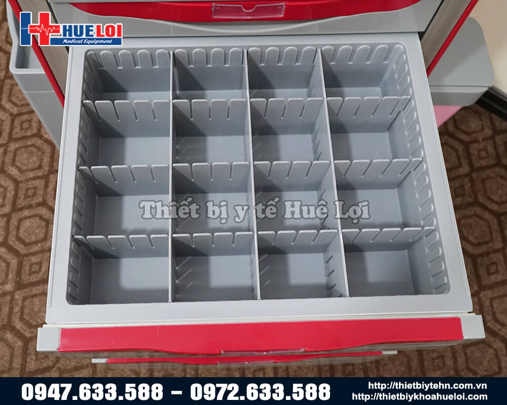 - Hộc kéo tủ: thanh ray được làm băng thép, hai ngăn tủ nhỏ trên cùng được chia ra làm nhiều ô nhỏ phù hợp cho việc chia thuốc cho bệnh nhân